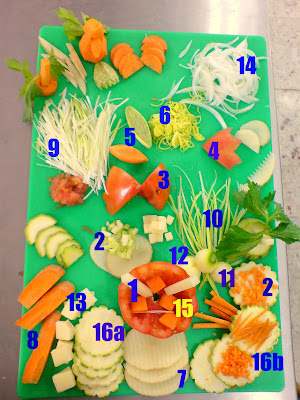 - VAN DICKE. Corte decorativo. Se utiliza generalmente en frutas y verduras de forma redondeada. Se hace cortes en forma de zig zag. Existen en el mercado cuchillos especiales que nos ayudan a realizar este corte con más precisión e igualdad. Ejemplo: Canastas de sandía, melón, etc.