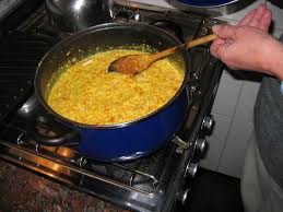 Por otro lado, se lava la sémola y se le agrega al agua hirviendo (conviene echarla en forma de lluvia si es polenta), removiendo constantemente durante media hora, hasta que se cocine. No debe espesarse (para ello es conveniente echarle agua cada tanto), antes de retirar del fuego se le agrega el jugo de limón.